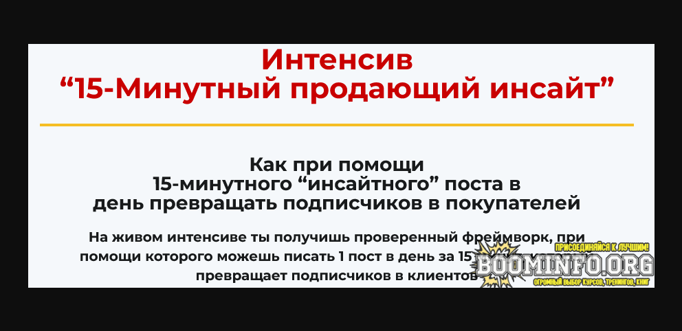 - “15-Минутный инсайтный фреймворк”, при помощи которого сможешь создавать продающие письма и посты быстро… не утомляя людей жестким обучающим контентом… не скатываясь в агрессивную продажу и манипуляцию.