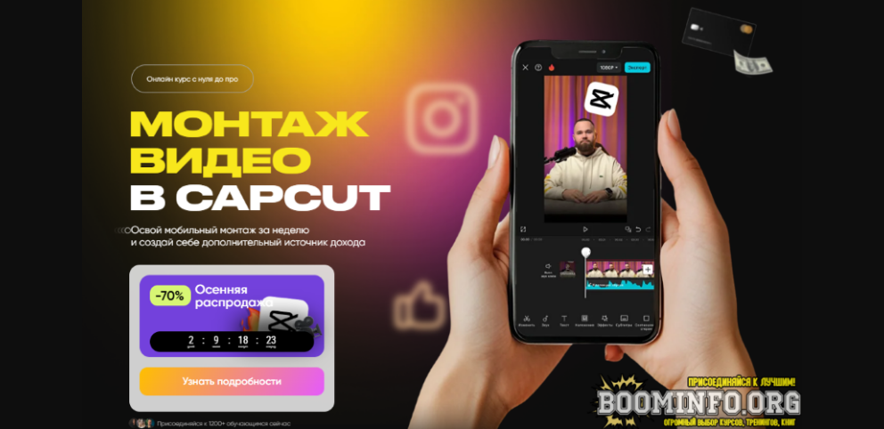 - В нём ты освоишь полный цикл монтажа на телефоне и научишься выполнять работы как для своего блога, так и для других заказчиков
